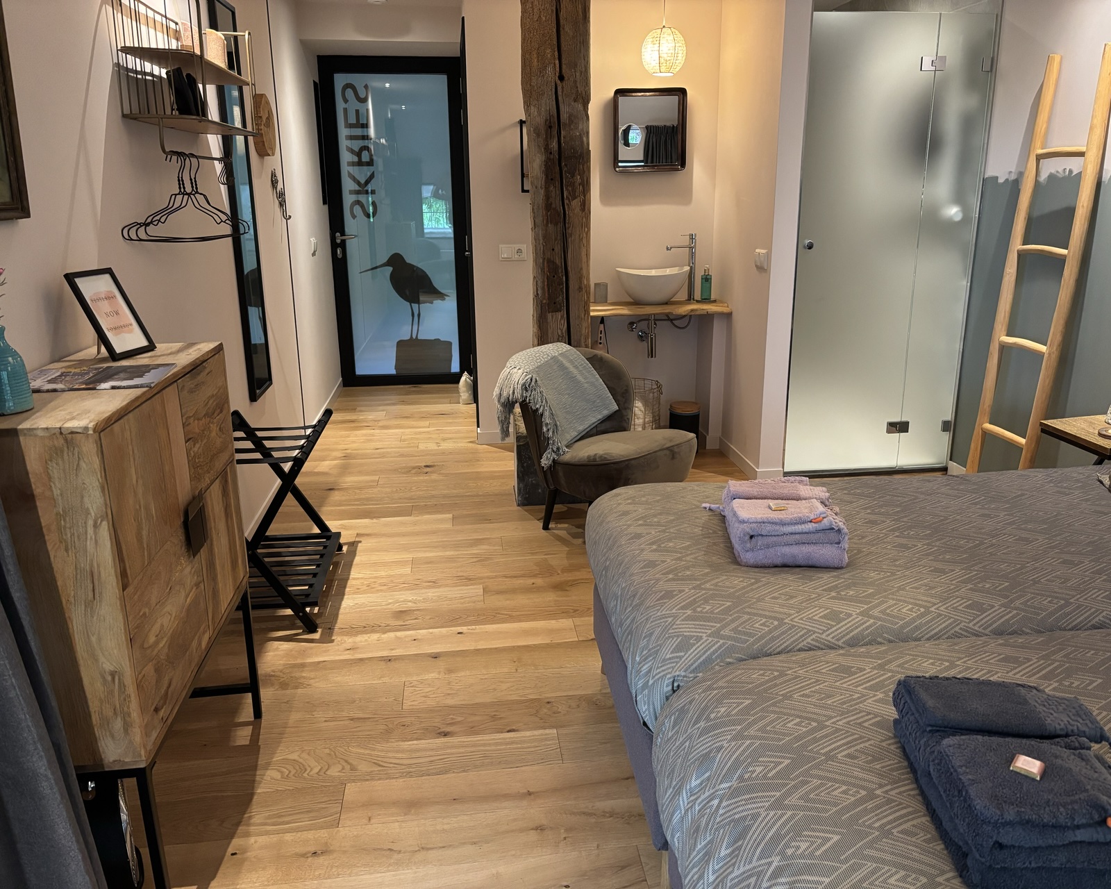Deze suite is vernoemd naar de Grutto, maar dan op z’n Fries. Hier en elders in Nederland staat deze vogelsoort voor het behoud van onze prachtige natuur en alle weidevogels. Midden in deze warme, sfeervolle kamer – met eigen toilet en luxe regendouche – staat nog een oud gebint dat verraadt dat je ondanks alle moderne voorzieningen toch echt in een eeuwenoude boerderij slaapt. Vanuit je kamer heb je direct entree naar het grote tuinterras op het zuiden. Dat geeft een extra buitengevoel en is puur genieten, zeker als de zon schijnt en jij vanuit je tuinstoel een zilte Friese bries door je haren voelt spelen. Even helemaal niets. De Skries is uitgerust met: