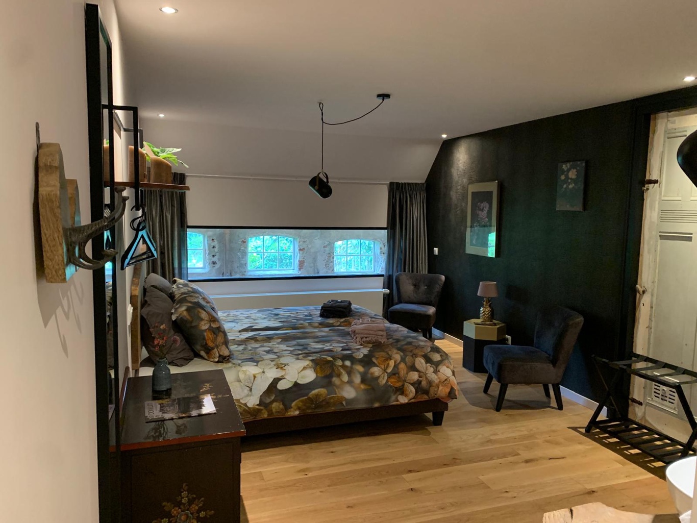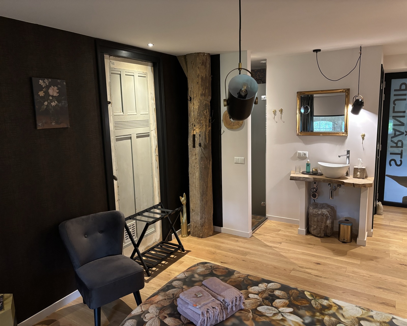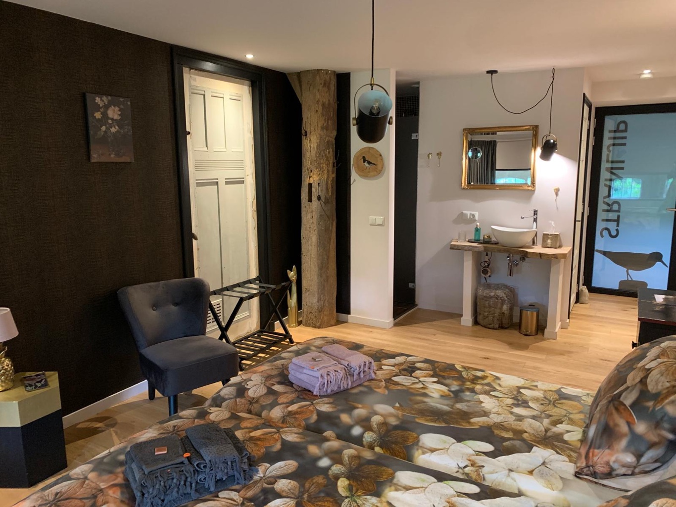 Deze behaaglijke suite – vernoemd naar de scholekster maar dan op z’n Fries – hebben we ontworpen in de ‘jaren 20’-stijl van de vorige eeuw. Het grote comfortabele bed (kan gesplitst worden), de eigen luxe inloopregendouche en het eigen toilet maken deze kamer compleet. De Strânljip geeft mooi uitzicht op de grote tuin door de gerestaureerde stalramen. De oude buitenmuur met her en der een drinkbak voor het vee herinnert aan die lang vervlogen tijden. De koeien zijn weg maar de tijdgeest van toen hangt er nog. Bijzonder genieten, dus. De Strânljip is voorzien van: