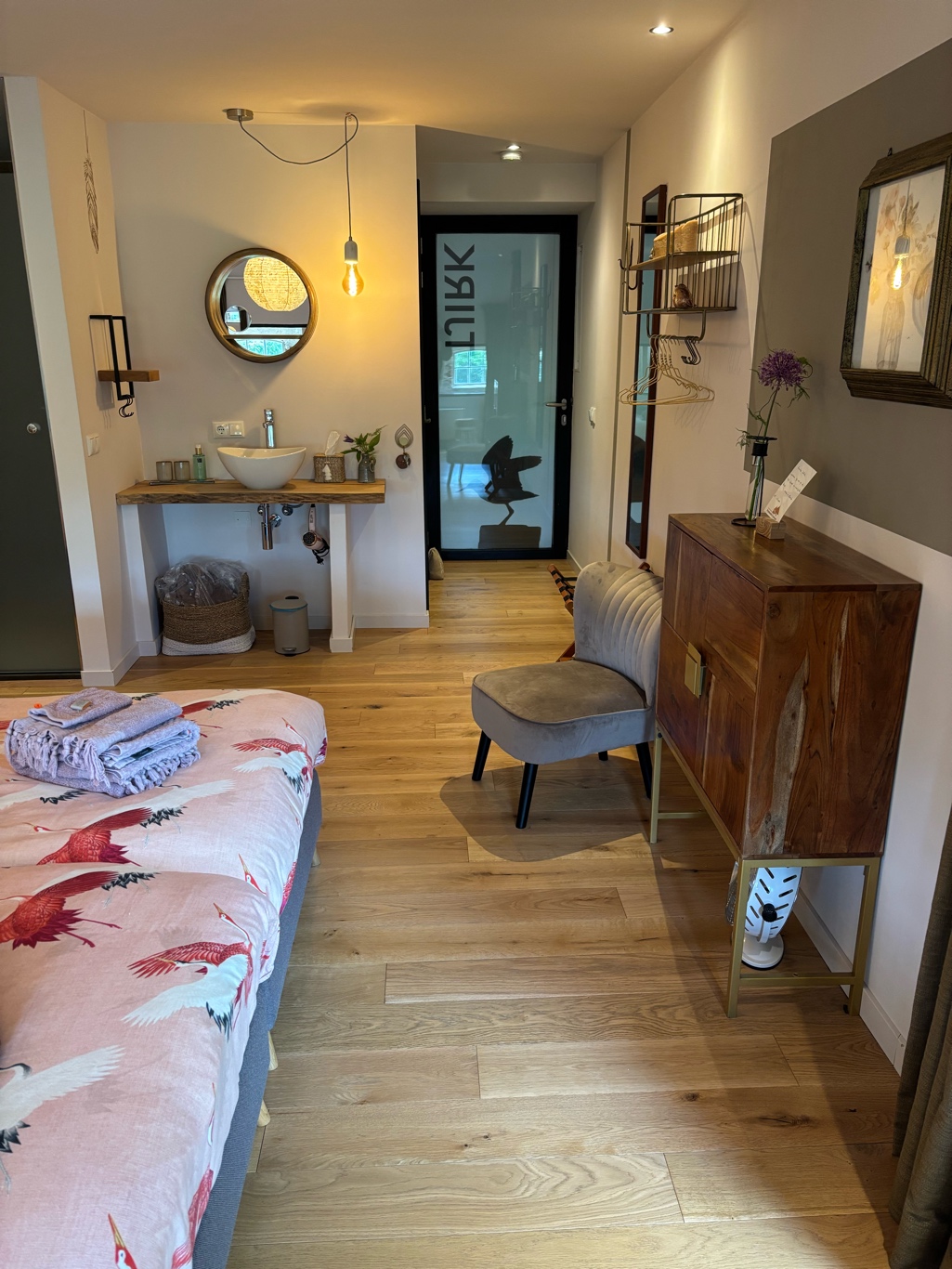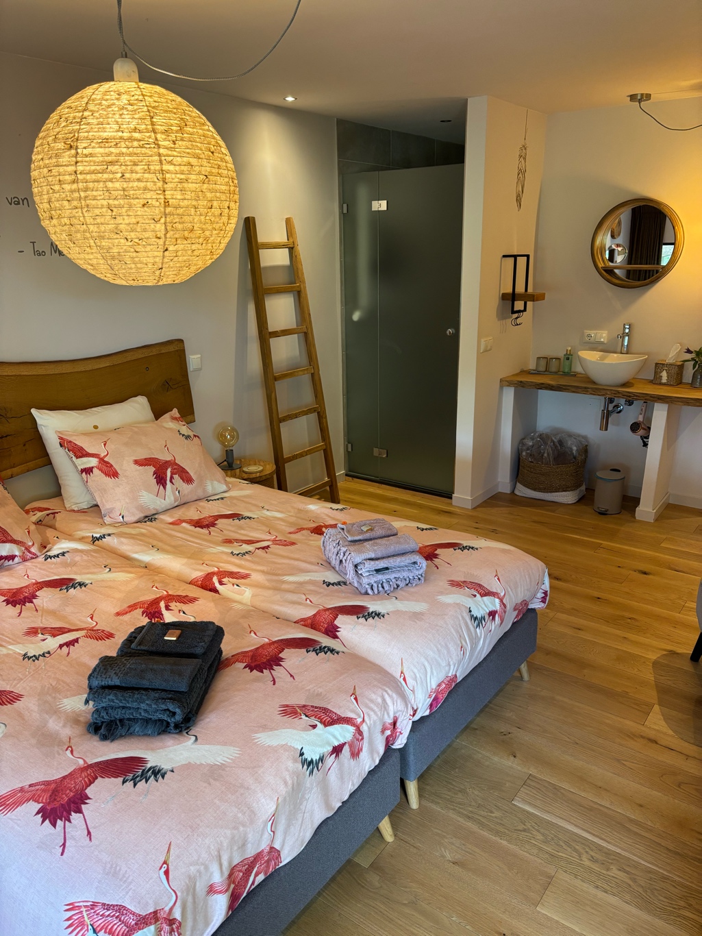 In deze heerlijke comfortabele suite, vernoemd naar de Tureluur, ervaar je de serene rust en de charme van natuurlijke houten elementen. Friezen noemen de tureluur een ‘Tjirk’ en is het kleinere broertje (of zusje) van de Grutto. Onze Tjirk beschikt over een luxe inloop regendouche en een eigen toilet. Het houten wastafelblad en het hoofdboard boven het bed hebben we gemaakt van een oude Friese es. Vanuit deze kamer heb je direct toegang tot het terras en loop je zo de tuin in. Een ‘grote groene oase’ op het zuiden omgeven door levende essen en iepen. Hier zul je heerlijk genieten. De Tjirk is voorzien van: